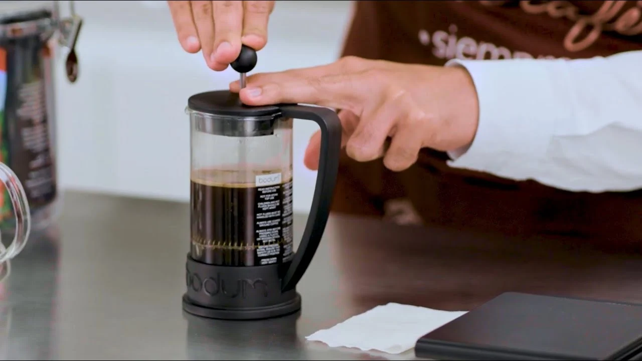 - Presionar el émbolo: Hazlo lentamente y con suavidad para evitar que los residuos pasen al café.